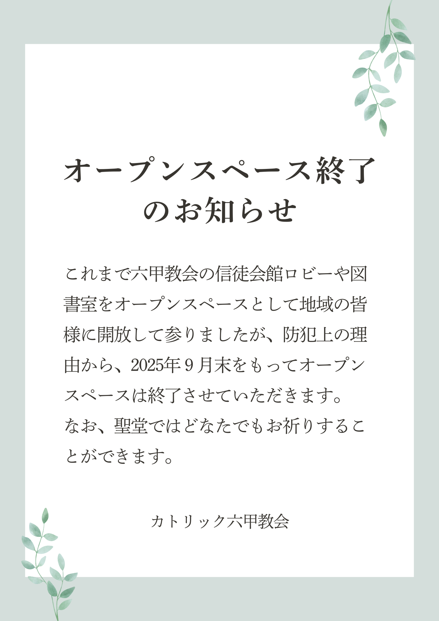 これまで六甲教会の信徒会館ロビーや図書室をオープンスペースとして地域の皆様に開放して参りましたが、防犯上の理由から、2025年9月末をもってオープンスペースは終了させていただきます。